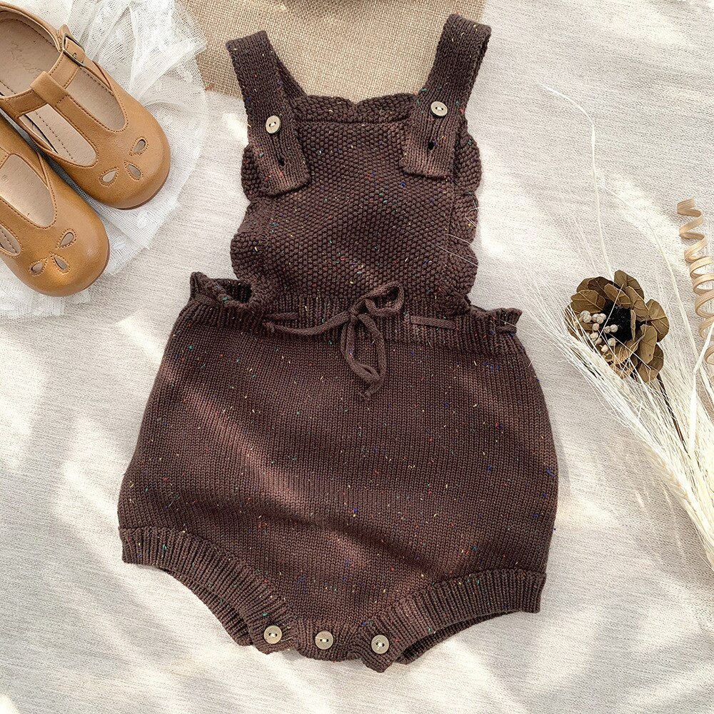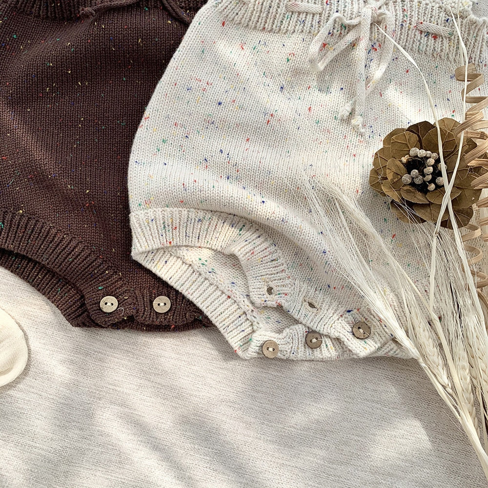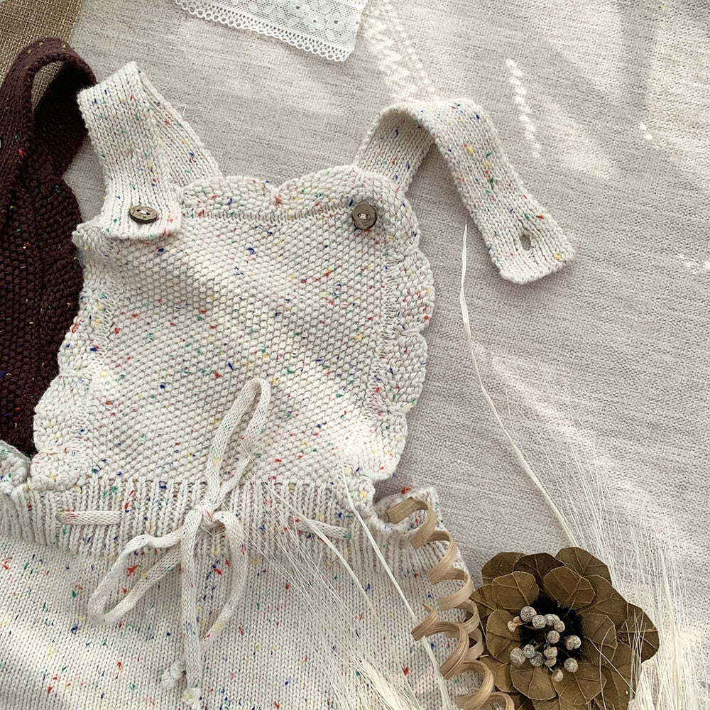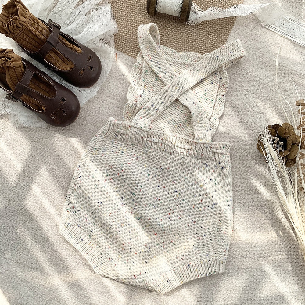 Knit romper with confetti print. Scalloped edge with drawstring waist.