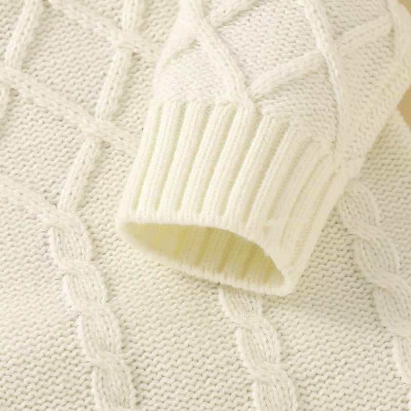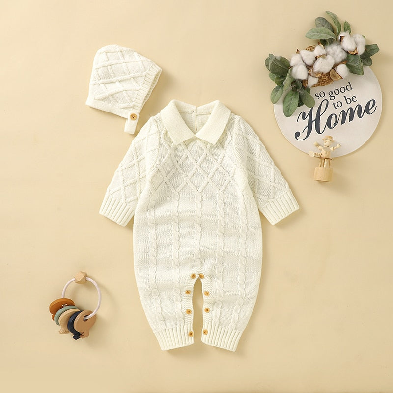 Long sleeve textured jumpsuit with contrasted pattern. Collared neck. Buttons in the back and diaper area. Comes with matching bonnet.