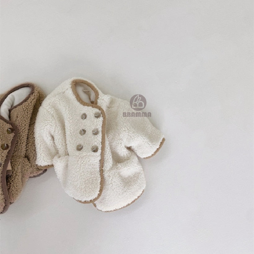 Soft and cozy sherpa jacket made from the warmest wool. Front pockets with double row of buttons. The neutrals colors make it easy and effortless to pair with other outfits.