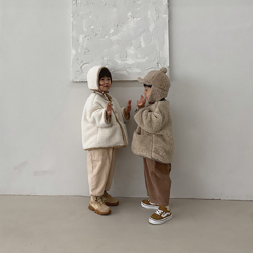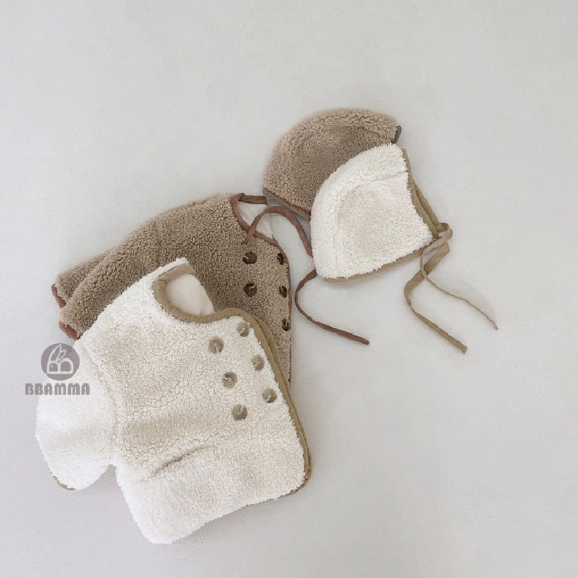 Soft and cozy sherpa jacket made from the warmest wool. Front pockets with double row of buttons. The neutrals colors make it easy and effortless to pair with other outfits. *Note: Hat not included