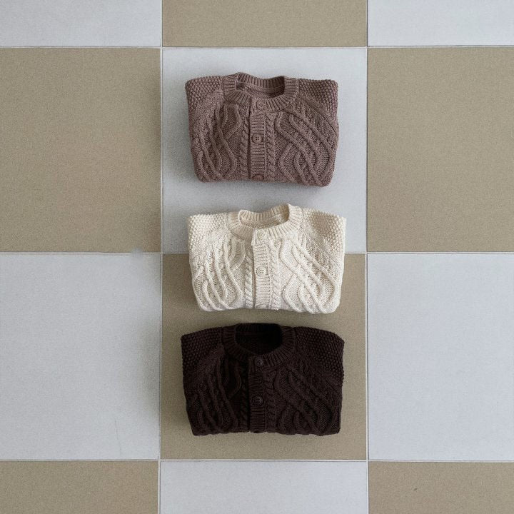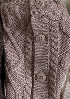 Long sleeve chunky cardigan with cable knit pattern. Round neck with buttons down front.
