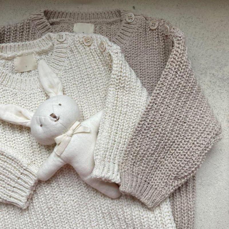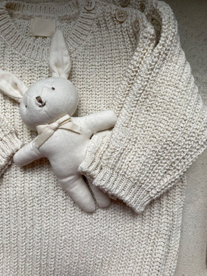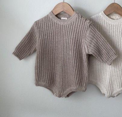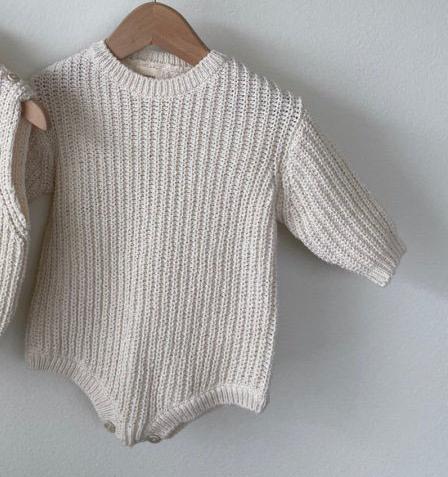 Long sleeve romper with chunky knit. Round neck. Buttons in the diaper and shoulder area.