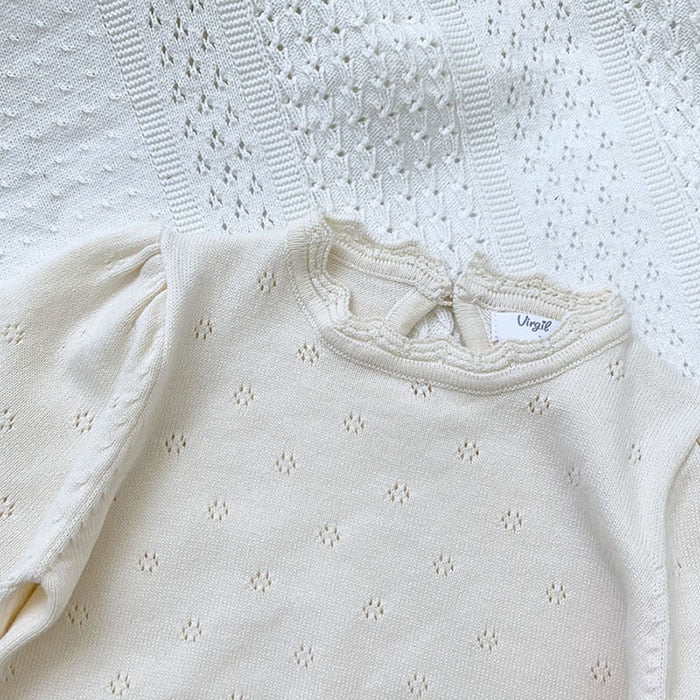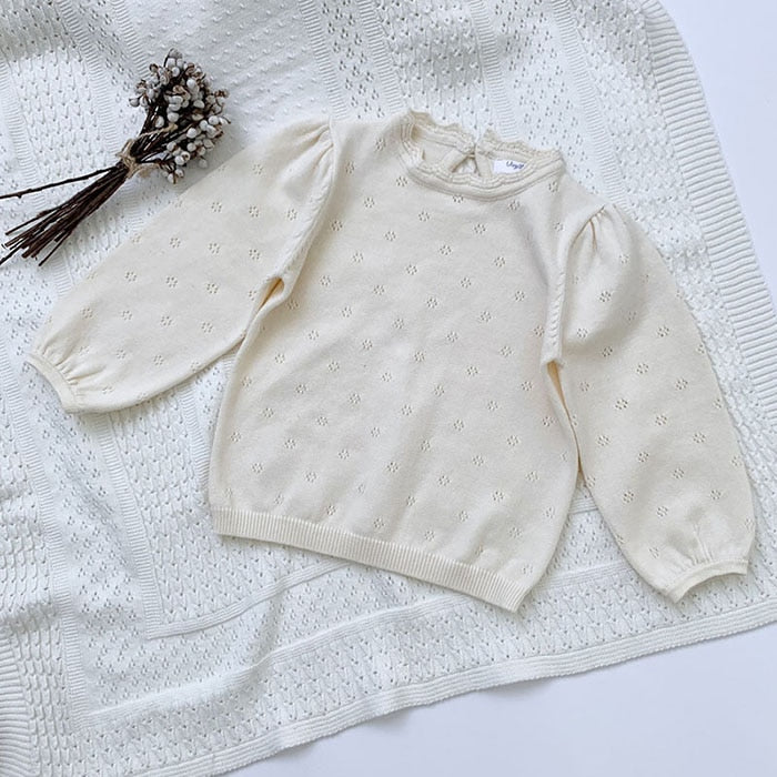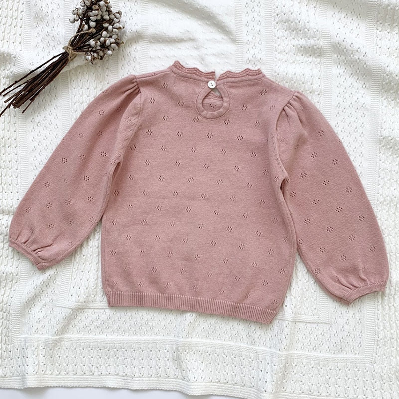 Long sleeve knit top with hollow out pattern. High ruffled neck with buttons in the back.