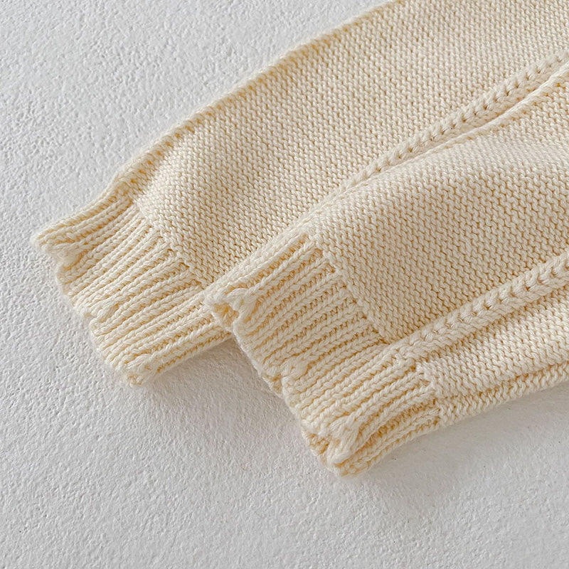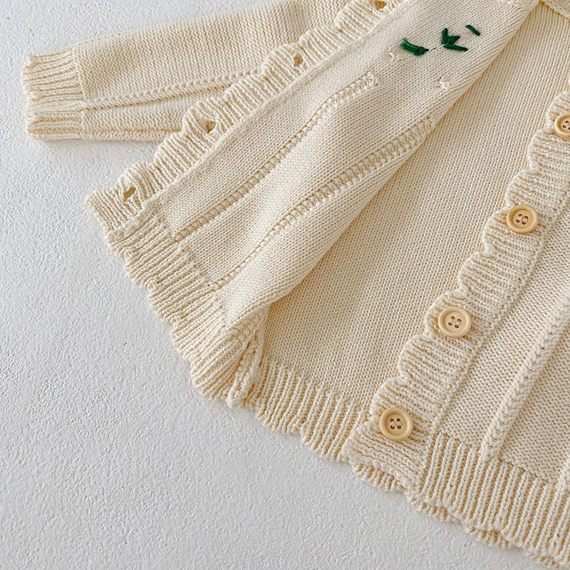 Knit set with long sleeve cardigan and matching romper. Intricate pattern all over with embroidered details.