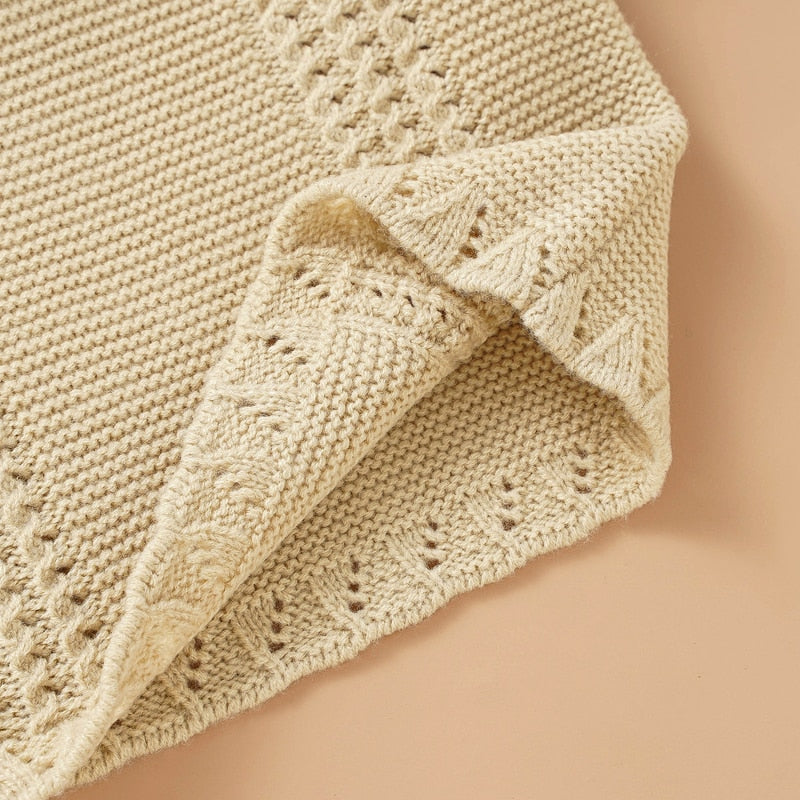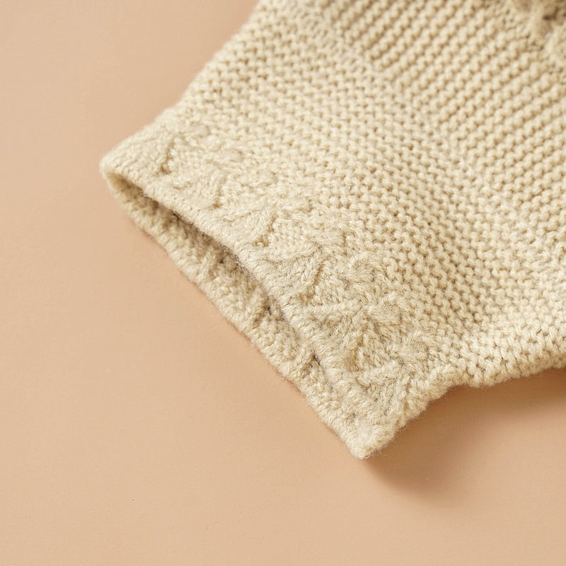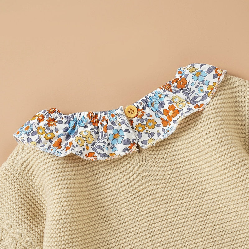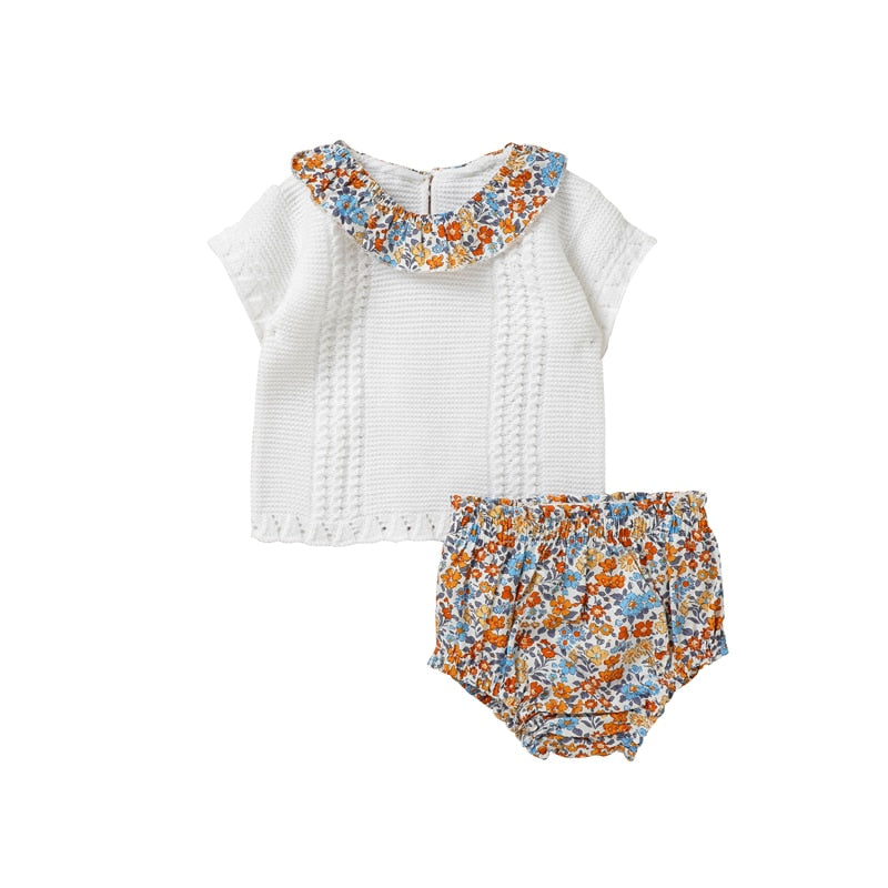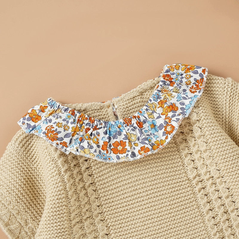 Knitted floral set with cable knit top and floral collar. Buttons in the back. Matching shorts with floral pattern and elastic waistband.
